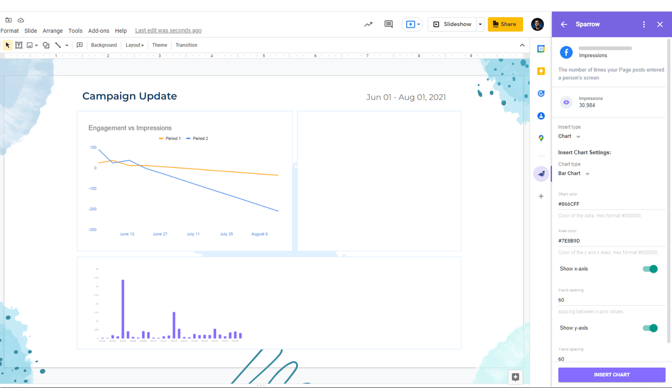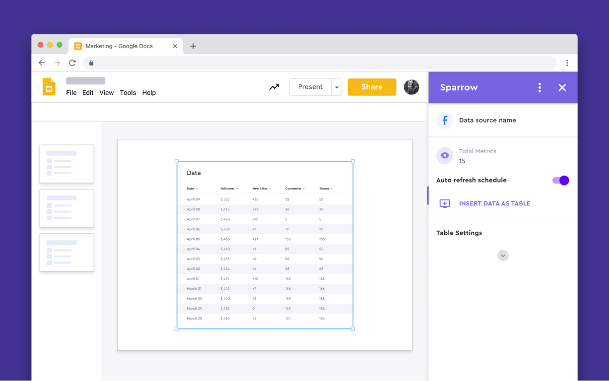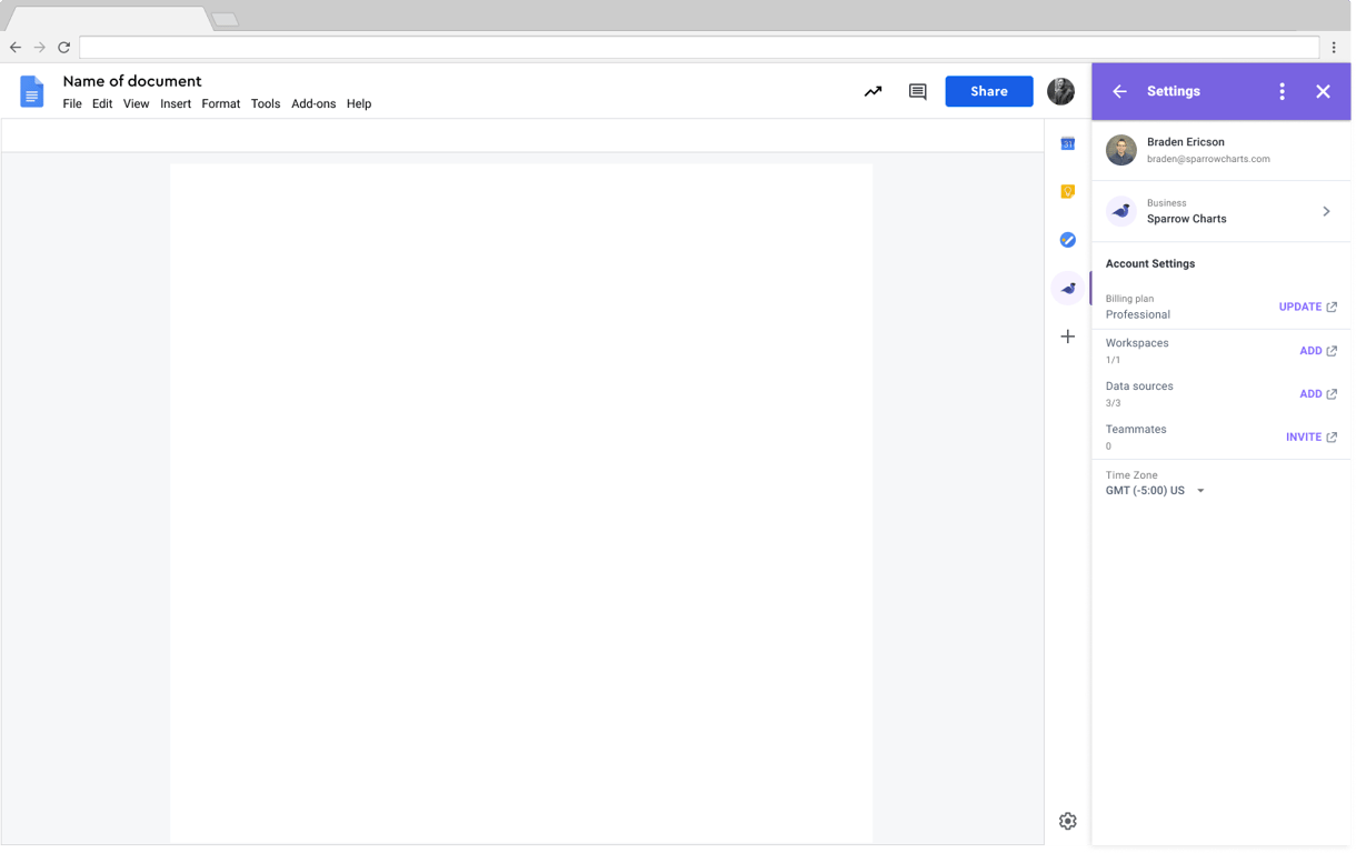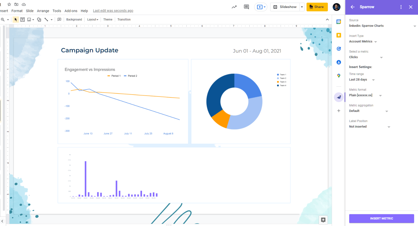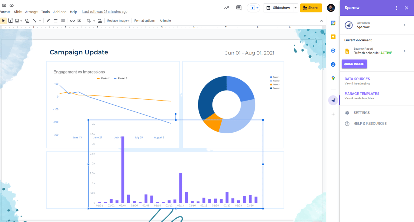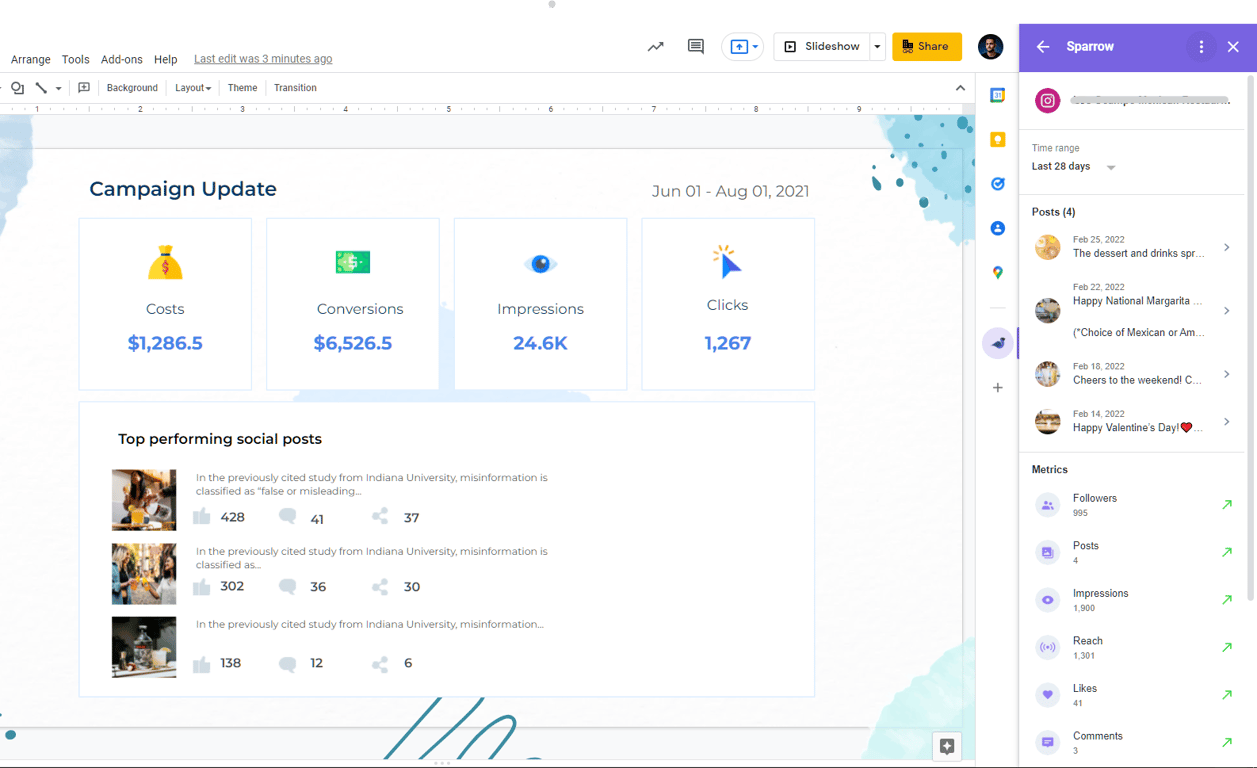 To get the most from Sparrow, users need to insert metrics into their own documents and then save those as private templates they can use over and over again. While powerful for someone who has a bunch of already built slides, it can be daunting for a new user to try and create a slide deck or spreadsheet from scratch.